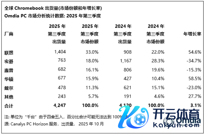 2025年第三季度,Chromebook商场同比增长3.1%。联念念在该细分商场发达特出,出货量达140万台,同比增长54.6%。宏碁以18%的商场份额位居第二,人人出货量为80万台。惠普名按序三,出货70万台,同比着落15.3%。相似受益于日本GIGA 2.0项运筹帷幄华硕位居第四,完了了令东说念主印象真切的59%同比增长,戴尔则位列前五。
